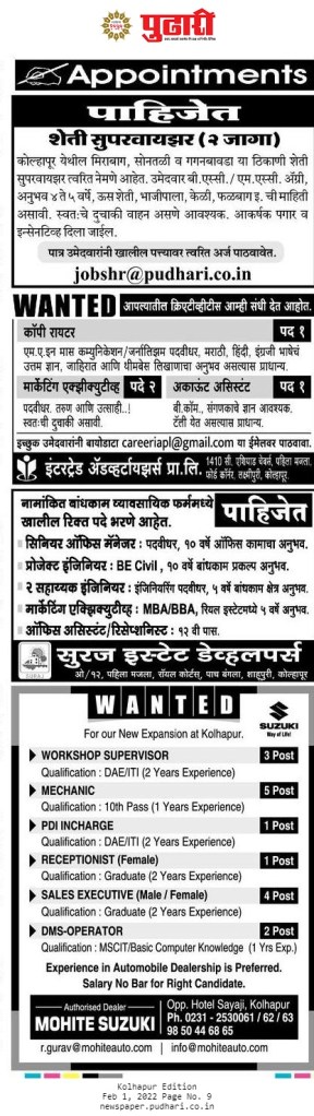 Kolhapur Pudhari Jobs Updates 01/02/22 Posted bymrisegroup1 Feb 2022Posted inKolhapur Jobs, New, newsTags:All India jobs, Kolhapur Jobs, news Subscribe our Telegram Channel and get daily job updates | Join Telegram Now Share this: Share on Telegram (Opens in new window) Telegram Share on WhatsApp (Opens in new window) WhatsApp Share on Facebook (Opens in new window) Facebook Share on LinkedIn (Opens in new window) LinkedIn Share on X (Opens in new window) X Email a link to a friend (Opens in new window) Email Like Loading... Related